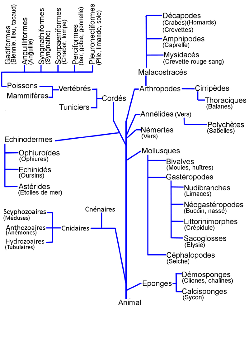 Les poissons Les crustacés Les mollusques Les Tuniciers Les échinodermes Les cnidaires Les cnétaires |